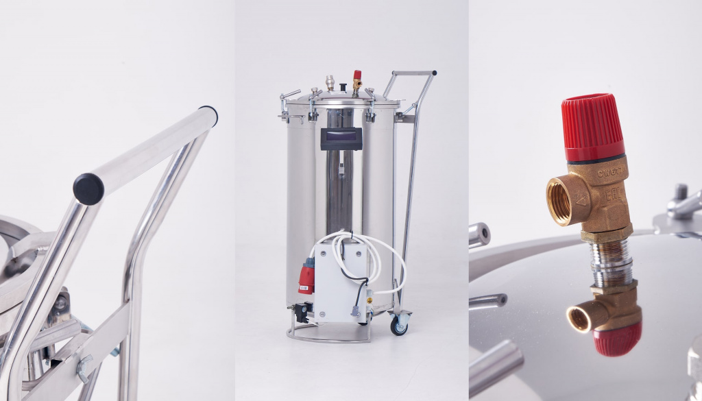 Изготовлен из нержавеющей стали, удобен и безопасен. Можно загрузить наполненную тару, установить программу для мяса, птицы, рыбы, ягод или плодов и заниматься другими делами. Он не занимает плиту, его можно установить на любой ровной поверхности. ЭБУ контролирует давление, температуру, поэтому аварийные ситуации исключены. Аппарат сам сливает воду после завершения цикла, чтобы можно было легко достать содержимое и не переваривать консервы.